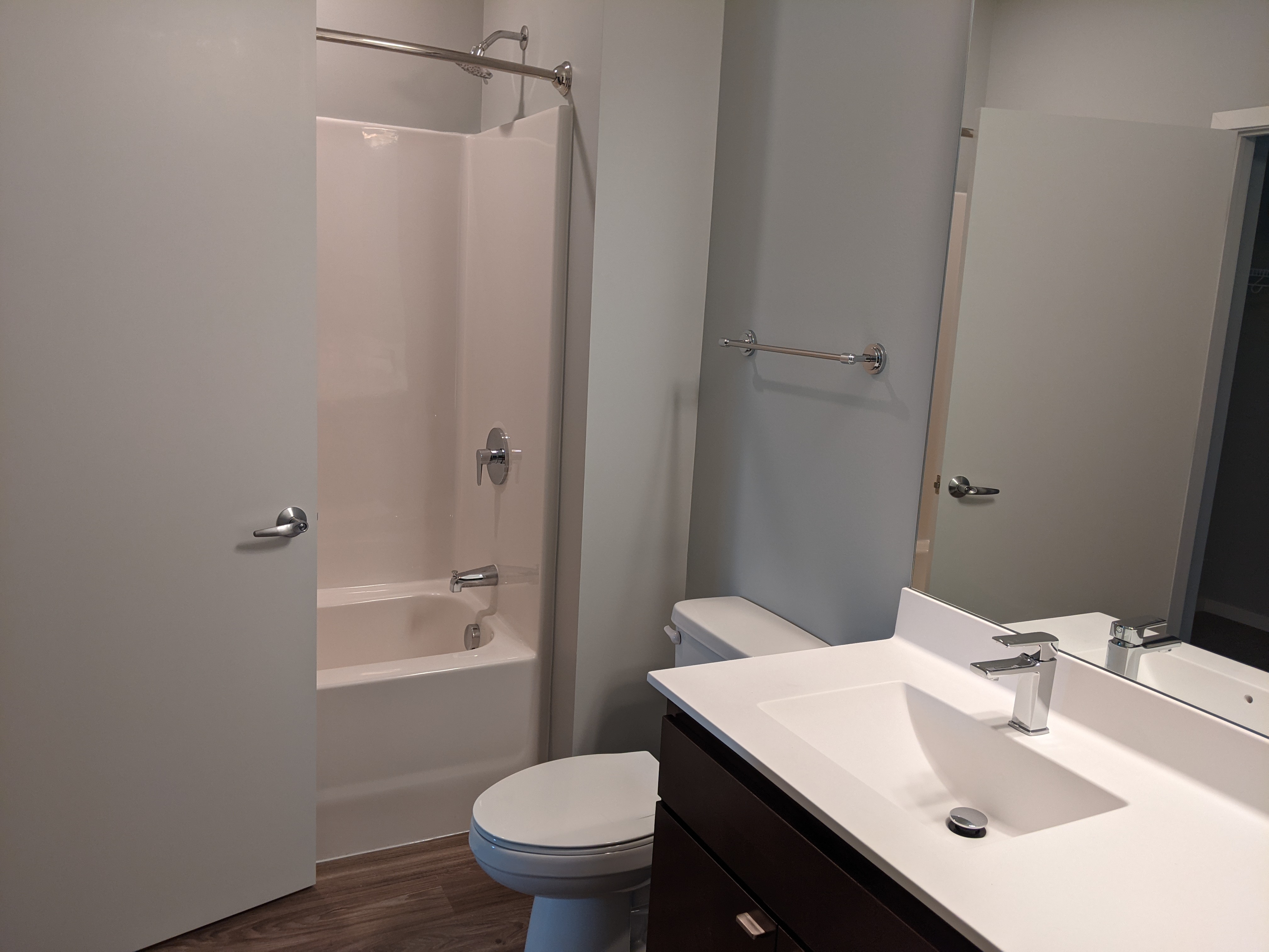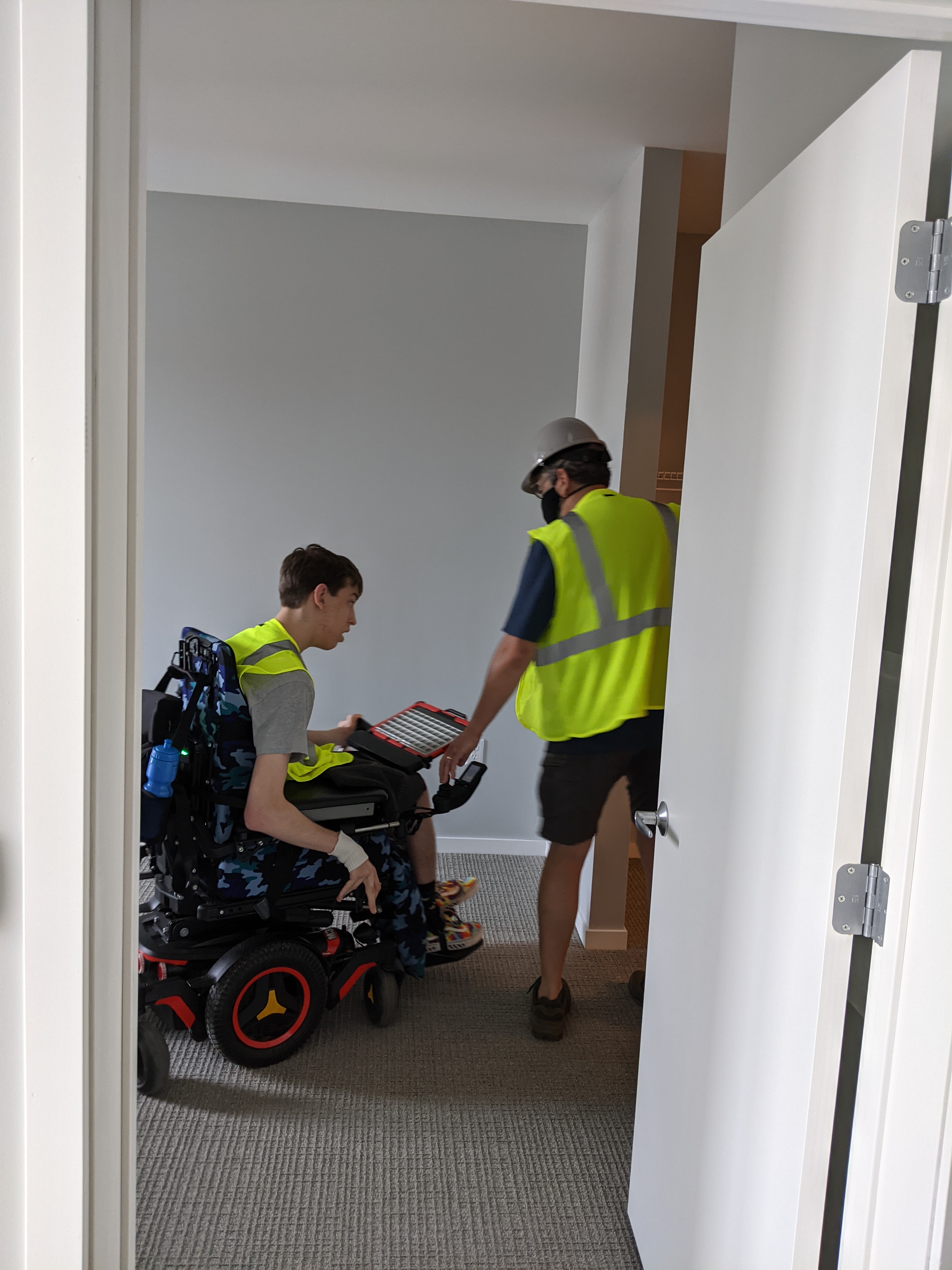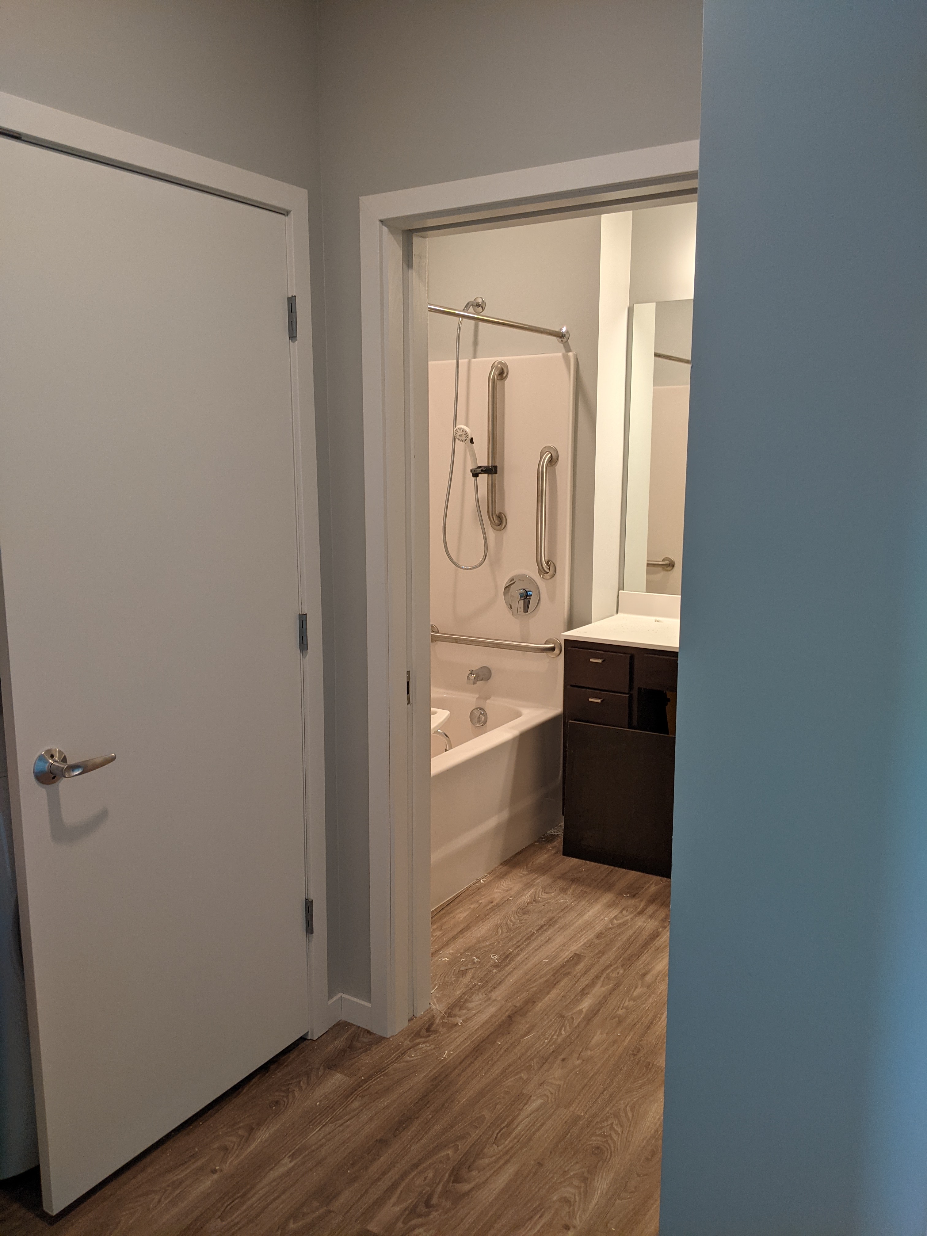 The floorplan we walked through for the non-accessible apartment would have been more accessible than the ADA apartment. With a roll-in shower and maybe another foot or two taken from the closet and added to the bathroom, this layout would have worked for me. And probably a lot cheaper to build than their “ADA accessible” apartment.