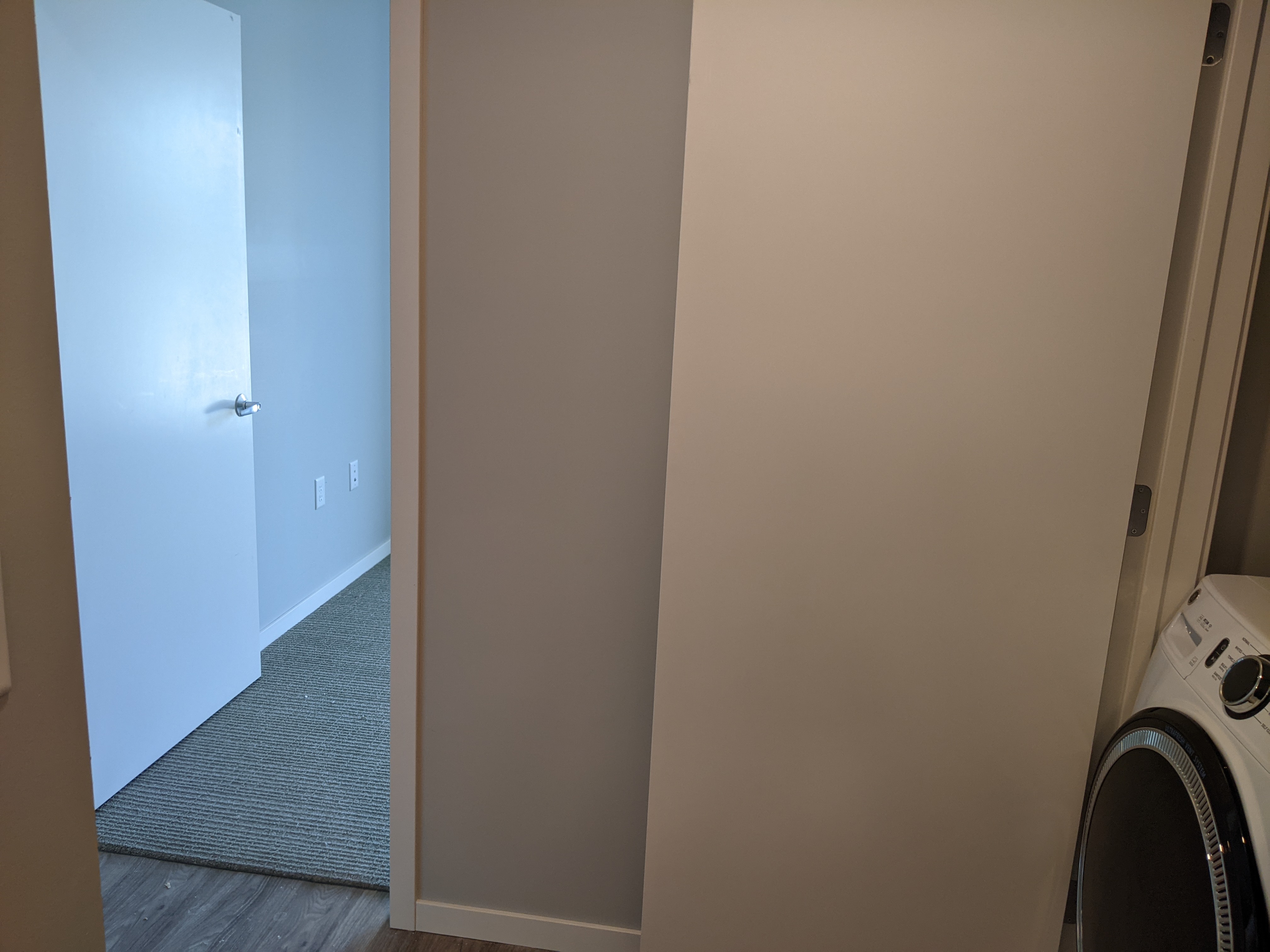 - Laundry closet in the hallway. What’s wrong with this picture? The washer juts out making it impossible to close the closet door. Maybe the washer wasn’t pushed back all the way???